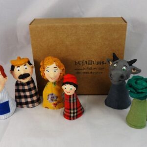 - 6 títeres de dedo: PATUFET (GARBANCITO), el PADRE, la MADRE, el TENDERO, el BUEY y la COL, para poder contar la historia. Ideal para familias cuentacuentos y niños y niñas amantes de cuentos populares!