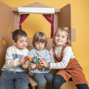 - Incluye la caja de cartón para poder guardar los títeres y el cuento escrito.